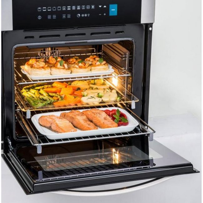 Com avançados recursos culinários e elegante design em vidro preto bisotado permite formar uma torre de fornos junto com o forno combinado TK34 e a gaveta aquecida TG15 nos mais refinados projetos de cozinhas planejadas.